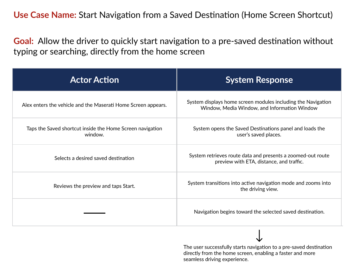 By redesigning the navigation flow on the Home Launch Screen, the system allows drivers to start navigation to saved destinations with fewer steps, supporting a smoother and more focused driving experience.