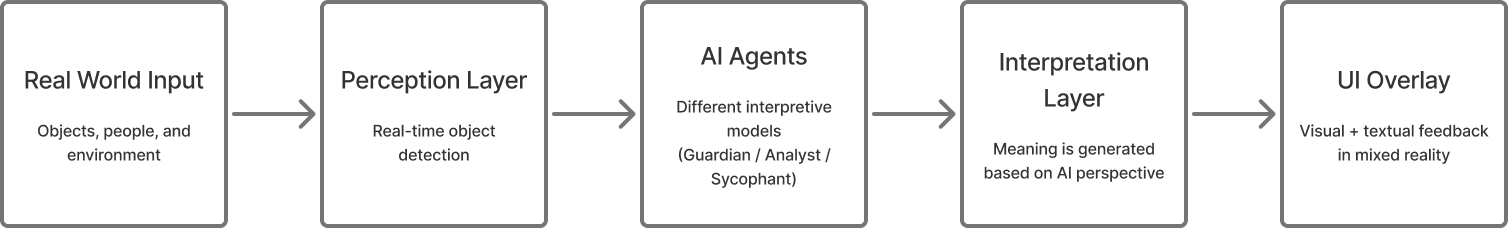 It continuously interprets and reframes the world in real time through AI agents with different perspectives. By shifting between these perspectives, the system reveals how AI can shape human perception and understanding.